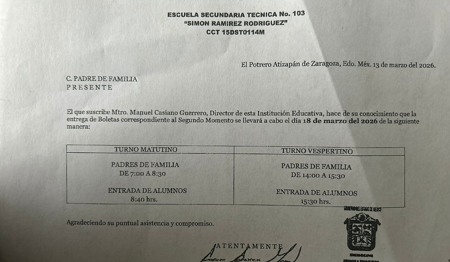 Señor Padre de Familia, por este conducto se le informa que el día de hoy 27 de octubre de 2025, en un horario de 8:30 a.m. a 10:30 a.m., podrán asistir por su credencial los padres de familia que no pudieron hacerlo la semana pasada.